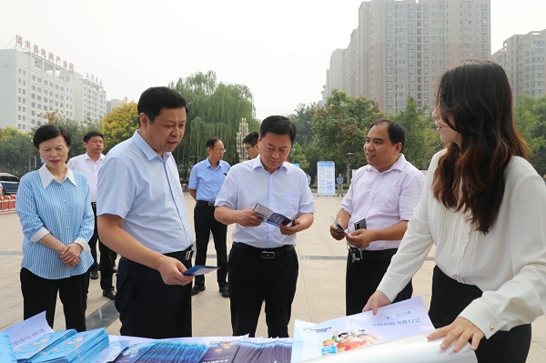 在活动现场,赵丹一行边走边看,不时驻足观看展板与现场工作人员交流,听取工作人员介绍,并认真翻阅宣传手册等宣传资料。