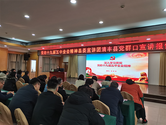 报告会上,县委党校陈瑞婷老师紧扣宣讲主题,结合清丰实际,对党的十九届五中全会主要内容和精神实质作了详细解读。报告重点突出、内容详实、脉络清晰,为大家更好地学习贯彻党的十九届五中全会精神提供了启发和辅导。参会人员专心聆听、认真记录,现场学习氛围浓厚。大家纷纷表示,要以此次宣讲报告为契机,更加深刻的理解和把握十九届五中全会精神的丰富内涵,以各项工作的实际成效贯彻落实好全会精神,为清丰经济社会高质量发展做出贡献。