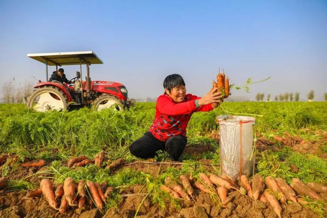 11月21日,河南省濮阳市清丰县马村乡孟卜村胡萝卜种植基地,村民正在采收胡萝卜,一根根红艳艳的胡萝卜带着泥土露出地面,田间一派繁忙的丰收景象。 近年来,清丰县大力调整产业结构,因地制宜发展农村特色产业,通过“公司+合作社+农户”的种植模式,派出农技专家提供技术保障,打通农产品销售渠道,让群众足不出村就能把蔬菜销售到各地。