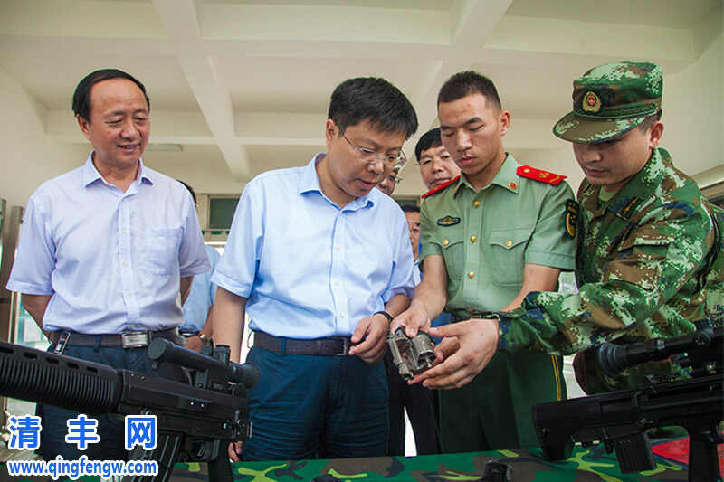 在武警中队,驻军官兵向县委书记冯向军讲解警用装备。