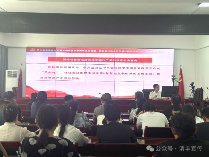 8月22日,县委宣讲团在城南街道办三楼会议室举行学习贯彻党的二十届三中全会精神宣讲报告会。街道办机关全体、各村支部书记、乡村首席服务员共计60余人参会。