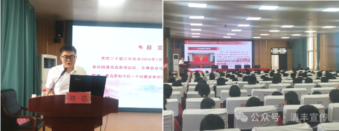 随后,宣讲团到仙庄镇初级中学进行宣讲,为全体教师和学生代表等300余人全面讲解党的二十届三中全会精神。从全会精神的重大意义讲起,阐述了全会对于新时代中国特色社会主义事业发展的深远影响。详细解读全会精神的核心要义,使师生们对党的最新政策和方针有了更加全面和深刻的理解。结合实际情况,就如何贯彻落实全会精神提出了具体建议和要求,鼓励师生们将全会精神转化为实际行动,为仙庄镇的发展贡献自己的力量。