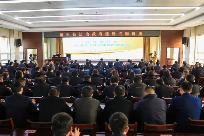 12月4日下午,清丰县举办法治政府建设专题讲座。县政府领导班子全体成员,县政府组成部门和负有行政职能的县直单位负责人、分管副职和相关股室负责人,各乡(镇)政府乡(镇)长共计160余人参加。濮阳市电视台全程直播,市直部门、各县(区)分别组织收听收看。