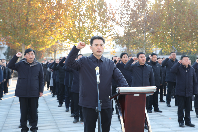 上午8时,全体人员整齐列队,庄严肃立,齐声高唱《中华人民共和国共和国国歌》。国歌唱毕,县委书记高尚功作为领誓人,右手举拳,面向中华人民共和国国徽,领诵誓词,郑重承诺对党的信仰、对国家的忠诚、对人民的热爱、对法律的尊崇。全体人员跟诵誓词,仪式现场庄严肃穆,宣誓铿锵有力。