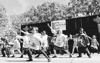 美国马里兰大学孔子学院近日举办“孔子学院日”庆典,庆祝该学院成立10周年。图为小学生在庆典上表演太极扇。 |