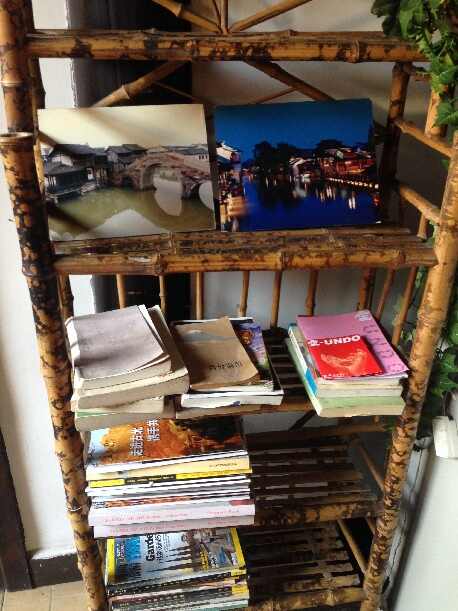民宿一角,上面摆着安妮宝贝的《素年锦时》和乌镇的明信片
