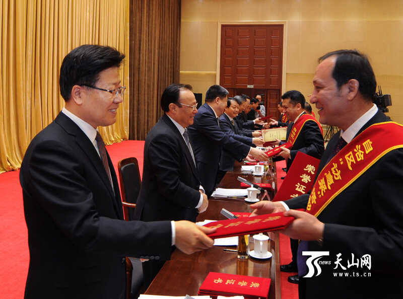 1月15日,自治区各级干部深入基层“访民情惠民生聚民心”活动表彰动员大会在乌鲁木齐举行。中共中央政治局委员、自治区党委书记张春贤等领导为自治区“访民情惠民生聚民心”先进工作组(队)、先进个人代表颁发荣誉证书。新疆日报记者卢民一摄 【视频】