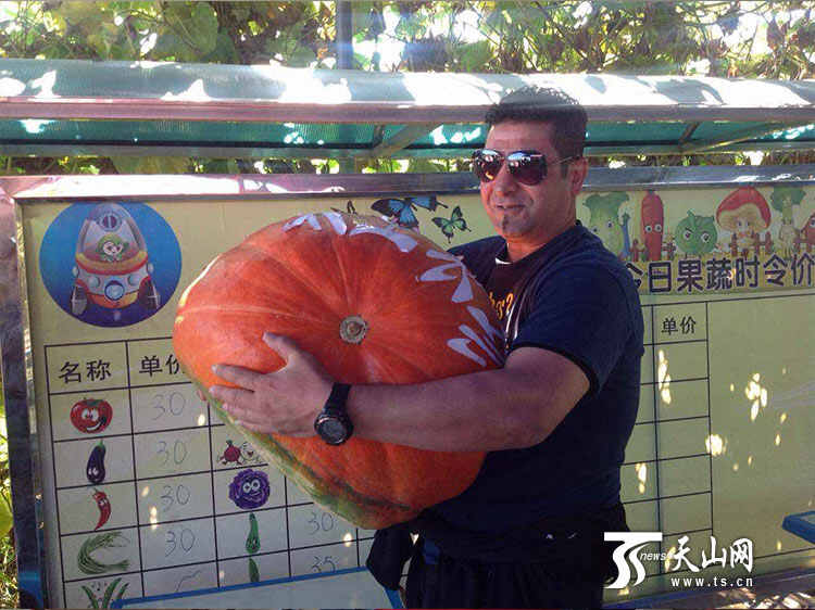 2015年7月,汤米参加公司组织的活动,在农家乐他抱起一个超大南瓜。(图由汤米提供)