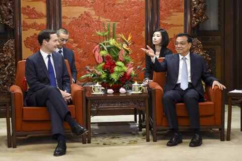 国务院总理李克强21日下午在中南海紫光阁会见来华出席第七次中英经济财金对话的英国首席大臣兼财政大臣奥斯本。图/新华社
