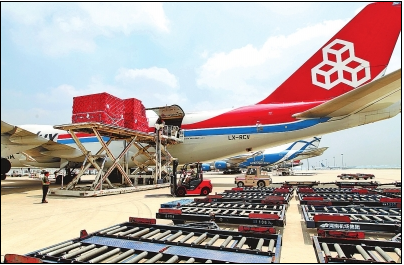 郑州机场工作人员正在给卢货航飞机装卸货物。资料图片