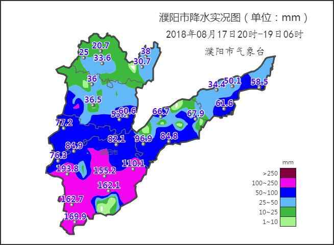 受台风“温比亚”外围云系影响,8月17日20时到19日06时,我市普降大到暴雨,各县区观测站总降水量分别是:濮阳84.9、清丰36.5、南乐33.6、范县66.7、台前50.1、华龙区99.2毫米。全市111个乡镇雨量站中,16个站出现100毫米以上降水,40个站出现50毫米以上降水,乡镇降水量排名前三的站点为濮阳县子岸站193.8毫米,濮阳县渠村站169.9毫米,濮阳县海通站162.7毫米。截止目前此次降水过程主要以稳定性降水为主,最大小时雨强36.1毫米,出现在濮阳县子岸站。