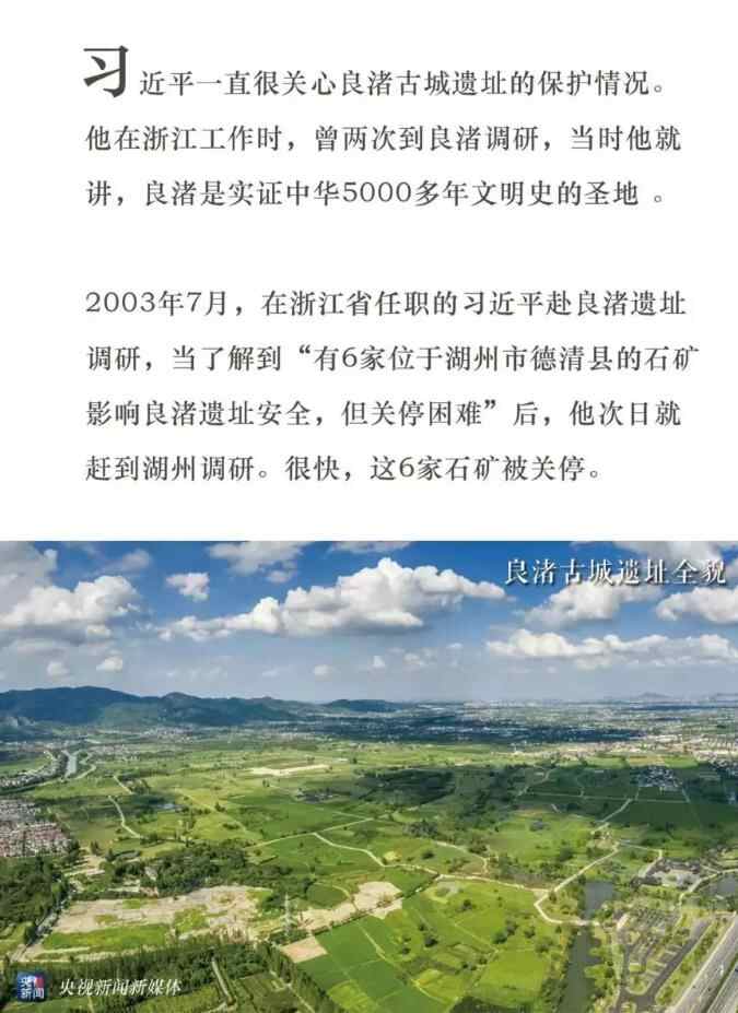2019年7月6日,良渚古城遗址入选《世界遗产名录》。 在浙江工作时,习近平曾两次到良渚调研。