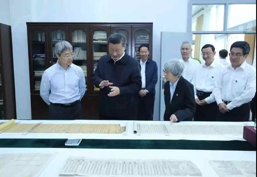△习近平总书记与专家学者交流。总书记左侧为敦煌研究院名誉院长樊锦诗,右侧为敦煌研究院院长赵声良。在敦煌研究院会议室,习近平总书记与30多位代表座谈,其中就包括敦煌研究院名誉院长、被誉为“敦煌的女儿”的樊锦诗。 2016年5月17日,总书记主持召开哲学社会科学工作座谈会时,也曾听取樊锦诗的发言。作为我国敦煌学研究权威专家的樊锦诗当时在会上说,我国的敦煌学研究一度发展比较缓慢,国际上曾流行“敦煌在中国,敦煌学在外国”的说法。 习近平总书记提出“一带一路”倡议,不仅是我国对外开放的一个大战略,也为敦煌学的发展提供了广阔的空间。这次在敦煌,总书记提出来: “文物保护一定要靠科技。 ”樊锦诗激动地说: “太有道理了! ”
