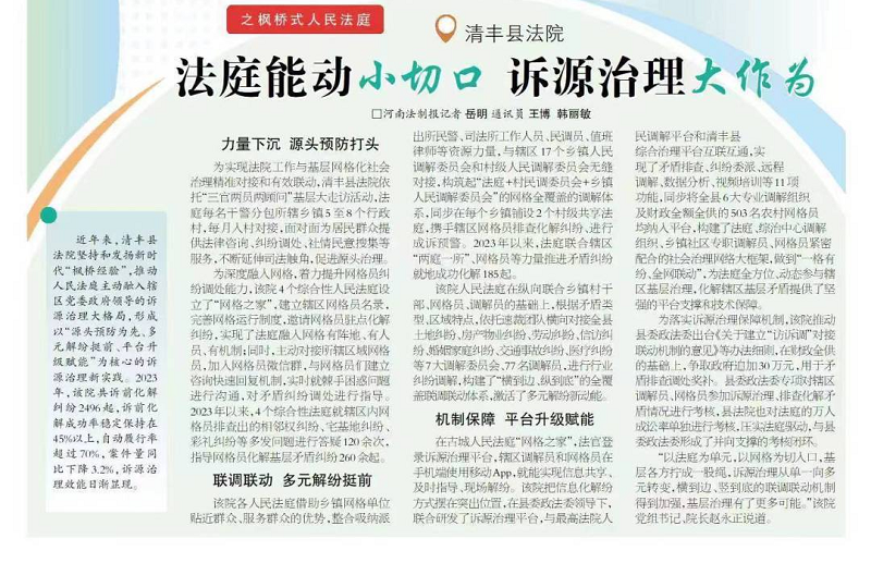 编者按:近年来,清丰县法院坚持和发扬新时代“枫桥经验”,推动人民法庭主动融入辖区党委政府领导的诉源治理大格局,形成以“源头预防为先、多元解纷挺前、平台升级赋能”为核心的诉源治理新实践。2023年,该院共诉前化解纠纷2496起,诉前化解成功率稳定保持在45%以上,自动履行率超过70%,案件量同比下降3.2%,诉源治理效能日渐显现。