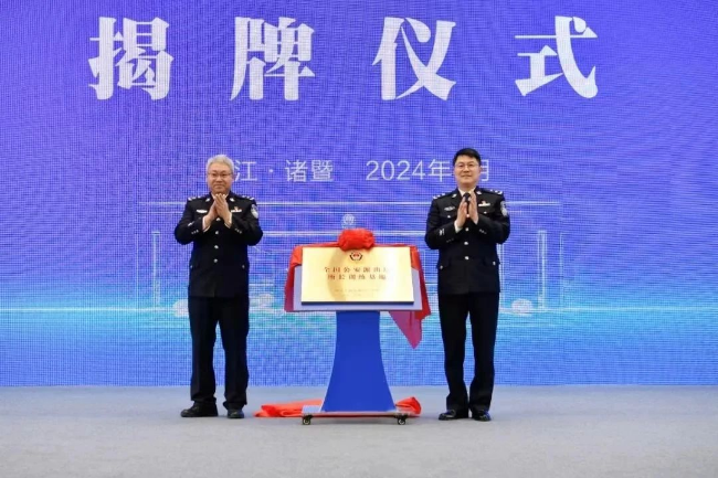 公安部治安管理局副局长尹春吉、浙江省公安厅副厅长魏明为“全国公安派出所所长训练基地”揭牌