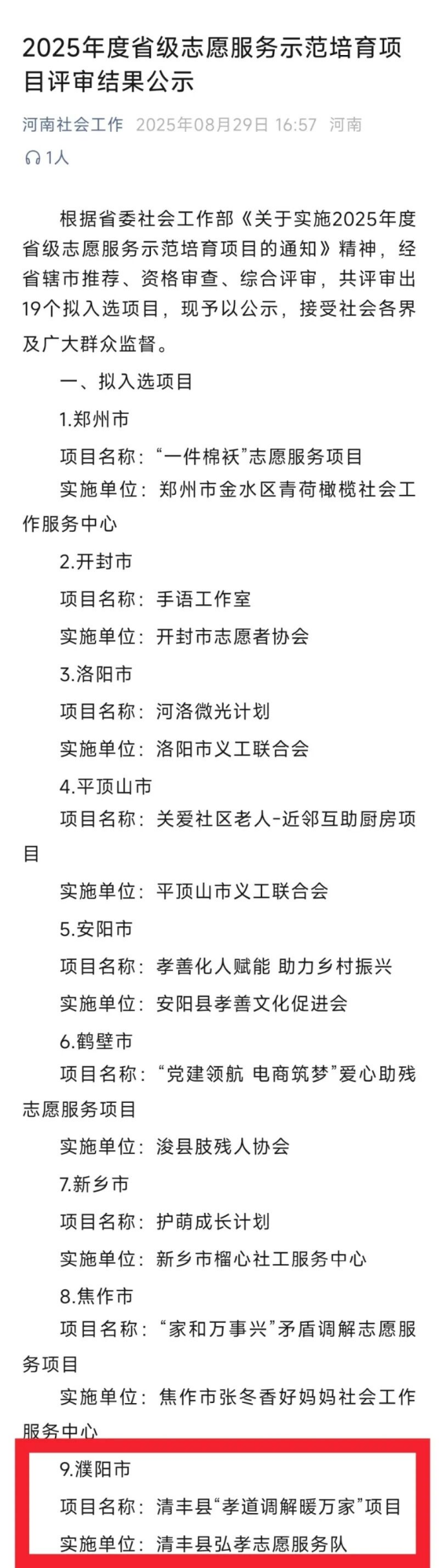 8月29日,中共河南省委社会工作部公示2025年度“省级志愿服务示范培育项目”评审结果。清丰县“孝道调解暖万家”项目榜上有名。公示显示,该项目是濮阳市唯一上榜的志愿服务项目。