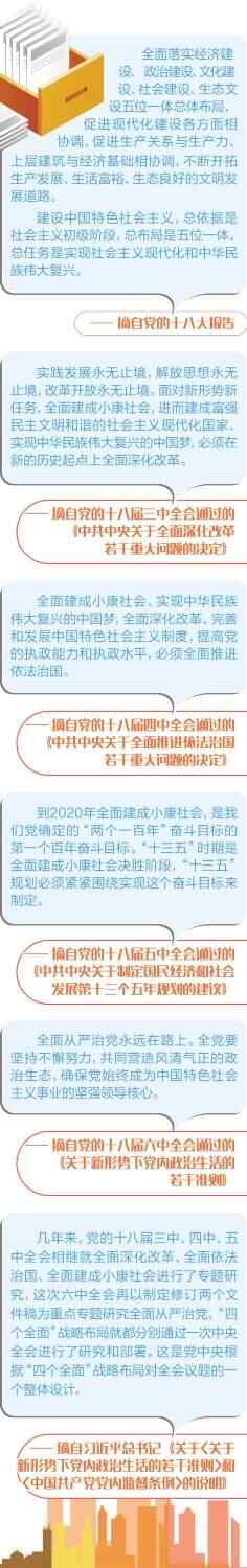 【核心提示】 习近平总书记指出,中国特色社会主义是全面发展的社会主义。党的十八大以来,我们党形成并积极推进经济建设、政治建设、文化建设、社会建设、生态文明建设五位一体的总体布局,形成并积极推进全面建成小康社会、全面深化改革、全面依法治国、全面从严治党的战略布局,在此基础上进一步强调要统筹推进“五位一体”总体布局和协调推进“四个全面”战略布局。