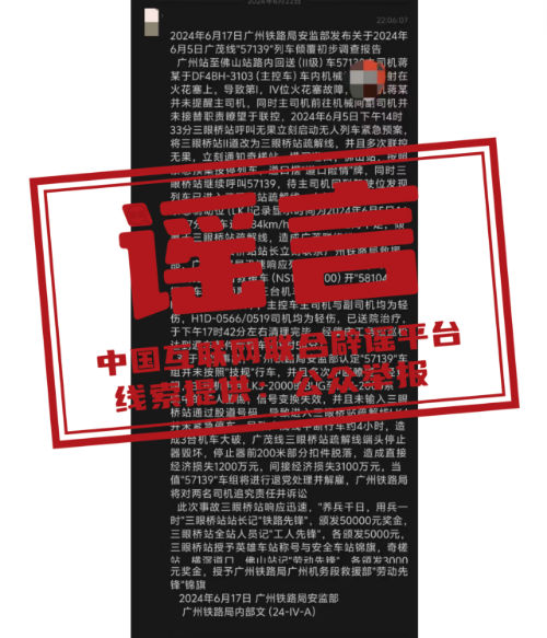 辟 谣 网传“广州铁路局安监部2024年6月5日广茂线57139列车倾覆初步调查报告”为虚假信息