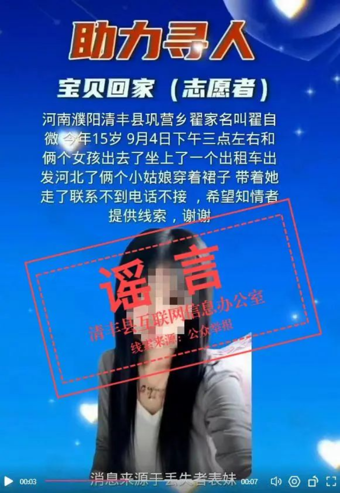 近日,有网民在某短视频平台发布全网寻找等助力寻人信息,经清丰县互联网信息办公室向公安部门核实,相关言论为不实信息,目前,该不实信息已删除。