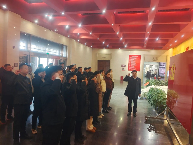 在冀鲁豫边区革命根据地旧址纪念馆,纸房乡党委主要负责同志为预备党员代表佩戴党员徽章;30名预备党员,面对鲜红的党旗,举起右手、握紧拳头,以铮铮誓言,表达坚定不移听党话、跟党走,薪火相传、接续奋斗的信念和决心。