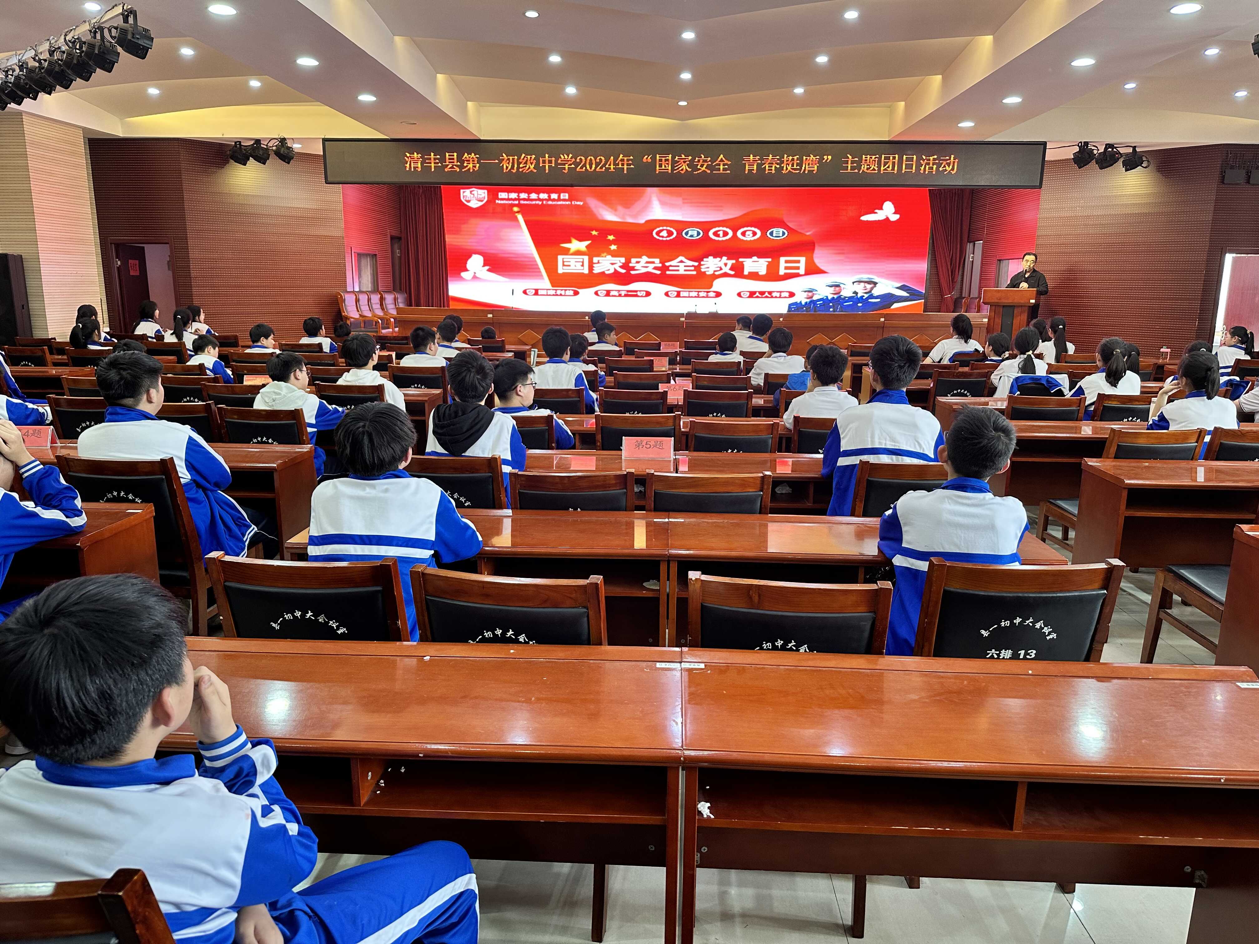 2024年4月15日下午,清丰县第一初级中学开展“国家安全 挺膺担当”主题团日活动,校团委周艾远老师从国家安全教育日设立的概况、掌握国家安全基本知识、真实案例学习、相关法律法规摘录等四个方面教育广大团员青年明白维护国家安全的重要性和必要性,明白维护国家安全与每个人的切身利益密切相关,以人民安全为宗旨也是“总体国家安全观”的核心价值。只有人人参与,人人负责,国家安全才能真正获得巨大的人民性基础,也才能有坚实的制度保障。