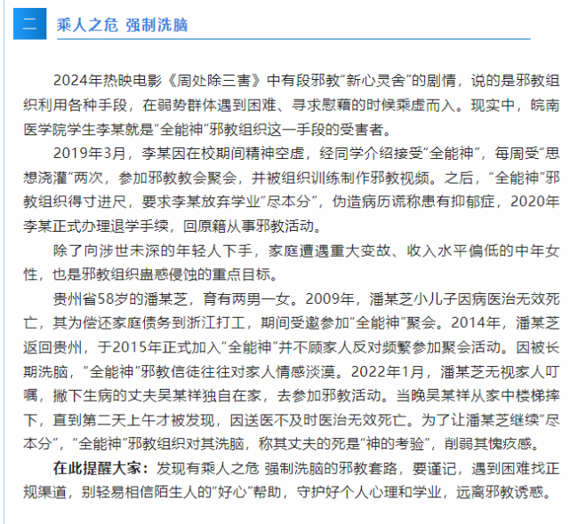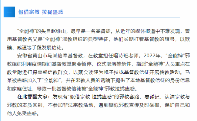 尽管近年来“全能神”邪教受到了国家的严厉打击,但其残存势力仍然暗流涌动,现实威胁尚未完全消除。