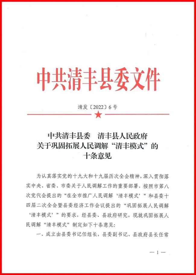 2月26日,清丰县在全县政法工作会议上印发了经县委第24次常委会议研究出台的《中共清丰县委 清丰县人民政府 关于巩固拓展人民调解“清丰模式”的十条意见》(清发〔2022〕6号)。