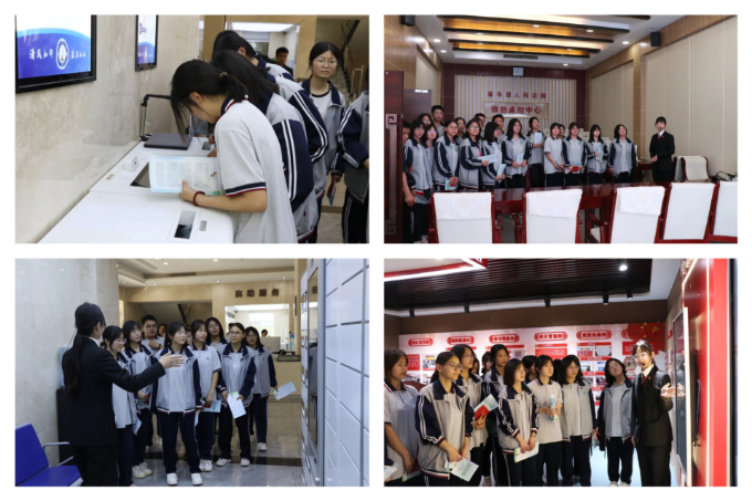 同学们先后参观了诉讼服务大厅、审判庭、党建廉政基地等场所,讲解员用浅显易懂的语言详细地向他们介绍自助立案、材料中转等相关区域功能,并讲解了法院的工作职能、业务办理流程、网上诉讼等相关工作,引导同学们体验了诉讼服务中心内的智能设备。在参观过程中,同学们对立案区内的智能设备充满了好奇,纷纷就感兴趣的内容提出问题,现场气氛十分热烈。
