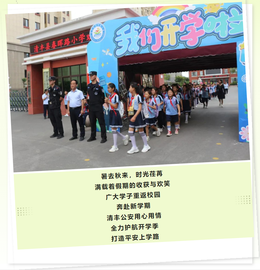 开学之际,清丰县公安局提前谋划、统一部署,结合全县师生返校实际情况,进一步完善校园周边上下学时段“高峰勤务”和“护学岗”工作机制,针对学校门前及周边道路提前组织警力开展定点疏导和巡逻管控,采取以车巡、步巡相结合的方式,加大巡逻密度和频次,提高见警率,全力以赴站好“护学岗”,确保营造良好的校园周边环境,保障师生安全有序入学、平安快乐回家。