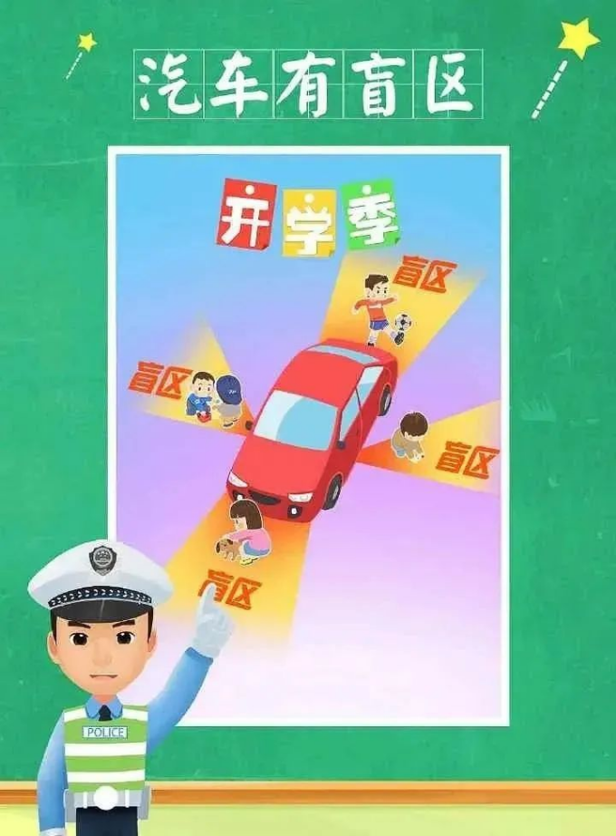 2.机动车的前后左右都存在一定的视线盲区,极易造成危险。孩子们切勿在车后方或者停车场内停留、玩耍,特别是汽车尾灯亮起时,要迅速远离;而在汽车前方通过时,低年级学生要将手高举,提高司机看到自己的几率,进而避免司机视觉盲区引发交通事故。