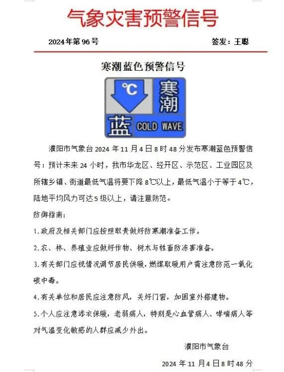 市气象台发布寒潮蓝色预警信号: