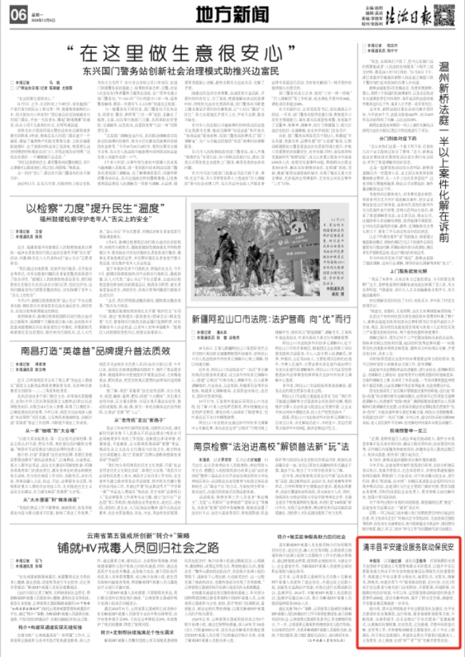河南省濮阳市清丰县围绕平安建设工作需要和群众实际需求,以提升平安志愿服务能力和水平作为加快推进基层治理现代化的重要抓手,探索建立平安志愿者与保安员、城管队员、交管员、调解员、网格员、快递员等“1+N”服务联动机制,在村(居、社区)形成平安志愿者与相关部门治安联防、矛盾联调、环境联管、问题联治的良好局面。今年以来,运用服务联动机制及时排查矛盾事件2608起,成功化解率93%,提升了群众安全感、满意度,平安建设基层基础进一步夯实。