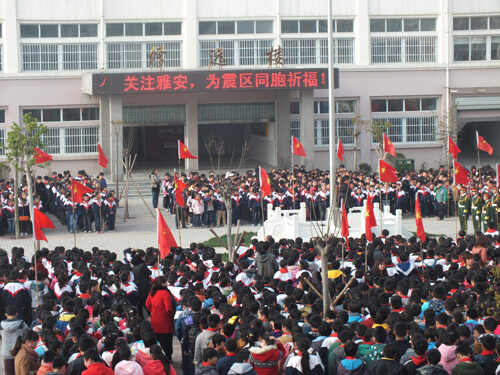 同时,广大师生十分关注四川雅安地震灾区,在升旗仪式上,全体少先队员为雅安人民祈福,愿逝者安息,生者坚强。