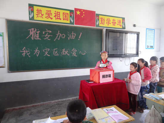 从雅安地震发生的那刻起,全校师生就开始密切关注灾区情况,心系雅安人民。全体师生将自己的捐款投进捐款箱中。一份份飞进捐款箱里的不仅仅是钱,更是全体师生的关心、问候和祝福。我们相信,灾区的人们一定能感受到我们的这份爱心,让那些遭受不幸的人们知道他们并不孤单。齐心合力,众志成城,相信雅安人民一定会战胜困难,重建美好家园。