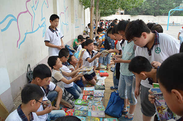 操场上,早早摆满了同学们带来的闲置图书,参加交易的各类课外读物样样俱全。整个市场“跳楼价,大出血”、“走过路过,千万不要错过!”等叫卖声不绝于耳。各班的推销员各出奇招,用各种独创的促销手段招揽着“顾客”,有的利用买一送一的营销手段,一下子引来了许多学生;有的用购书送礼物的方式来促销;有的索性扯起嗓子大声叫卖;有的干脆拿起图书,走进人群中推销……吸引的老师们也加入到购书队伍中。每当一笔交易成功了,同学们就高兴万分,好多同学在现场就迫不及待地交流起自己的淘书心得。