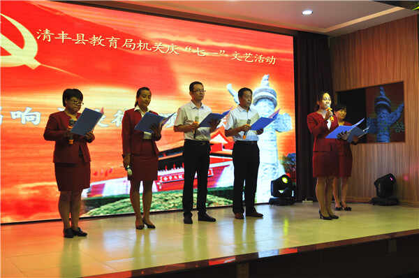 演出在大合唱《百姓的好镇长》中拉开帷幕。局机关干部职工的节目精彩纷呈,接下来朗诵了《沁园春·雪》、《脊梁》、《七律·长征》、《我的祖国》,戏曲《沙家浜》、《我们是工农子弟兵》,合唱《没有共产党就没有新中国》、《学习雷锋好榜样》、《党啊,亲爱的妈妈》、《红旗飘飘》,独唱《军港之夜》、《最美的歌儿唱给妈妈》、《小白杨》、《在那桃花盛开的地方》等,在场观众掌声雷动,叫好不断。通过不同的艺术形式、健康向上的文艺节目,表达了全县教育系统干部职工对党的生日祝福和无限崇敬之情。演出结束后,面对党旗,局党组副书记、副局长黄东明带领全体党员重温了入党誓词。