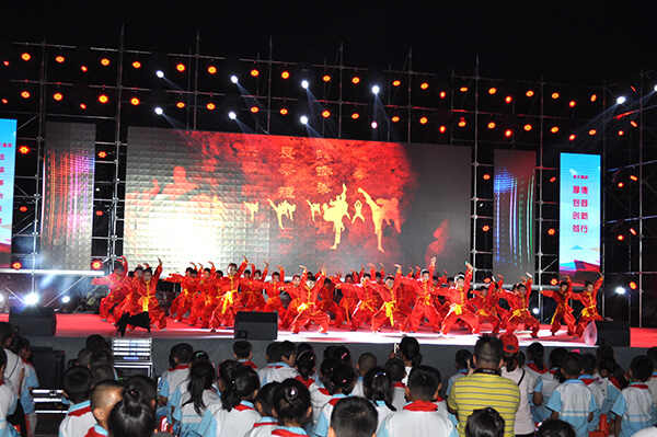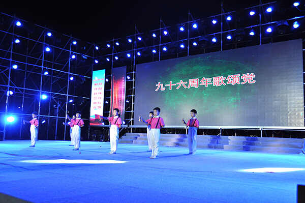 演出在舞蹈《鼓动飞扬》中拉开序幕,少儿群舞《映山红》、舞台剧《中国梦》、表演唱《绣红旗》、短剧舞蹈《在灿烂的阳光下》、独唱《不忘初心》、大合唱《歌唱祖国》、诗朗诵《追梦》、武术操《风云》、快板《九十六周年歌颂党》和歌伴舞《走向复兴》等10个丰富多彩的节目,把演出推向一个个高潮,赢得在场3000余名观众阵阵掌声。