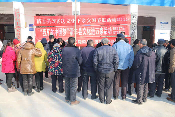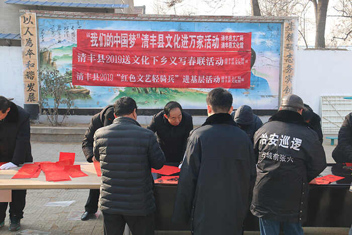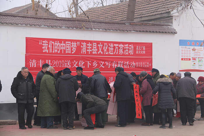 为贯彻党的十九大精神,落实“文化惠民”政策,使我县各贫困村广大群众过一个喜庆祥和的春节,元月14日—25日,县文广局、县文化馆组织十余名书法家深入到我县15个乡镇24个贫困村开展了为期12天的清丰县“红色文艺轻骑兵”新春走基层——2019“我们的中国梦”清丰县“文化进万家”义写春联活动。
