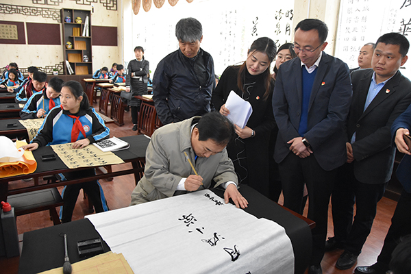 在我校书法教室,朴市长与孩子们亲切地交流,伸出大拇指对孩子们的书写表示赞赏,随后他用毛笔亲手写下“明月湖小学”五个大字并合影留念。