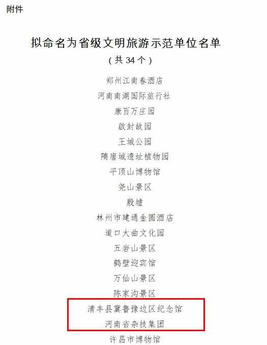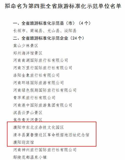 其中,我市的清丰县冀鲁豫边区纪念馆、河南省杂技集团进入2022年省级文明旅游示范单位公示名单;濮阳市东北庄杂技文化园区、清丰县冀鲁豫边区革命根据地旧址纪念馆、濮阳迎宾馆进入第四批全省旅游标准化示范单位公示名单。