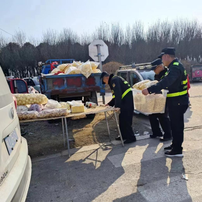 开展“护航”服务,确保群众出行安全。孝道文化园作为我县重点景区,是广大市民游玩的首选之地,同时也是执法大队为落实省市县第一季度“开门红”要求设置的临时市场之一。为确保孝道文化园周边和临时市场经营秩序,大队领导坚持“一线工作法”,实行日常管理与错时服务相结合工作机制,全天候对园区周边和园区内临时市场进行巡查值守。对景区周边占道经营流动商贩进行劝导清理,引导进入临时市场内有序、合理摆放经营;同时与公安交警建立联动机制,共同维护孝园周边机动车辆、非机动车和人员秩序,确保市民春节期间出行游玩安全畅通。