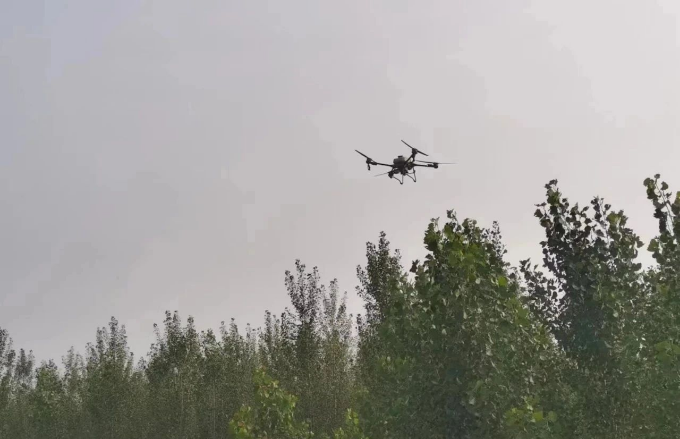 经巡查发现,阳邵镇翟固、霍町等围村林及南林高速两侧的杨树片林受害明显。该局紧抓最佳防治期,出动两架无人机,使用0.5%虫菊苦参碱和虱螨脲药物进行喷洒,累计飞行150个架次,有效防治林木3750亩,明显遏制虫害蔓延。